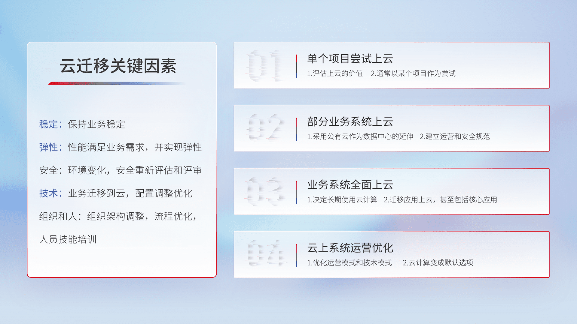 结合实际业务,,,,从规划设计、、、云平台选型、、、云原生改造、、数据迁移、、、集成交付,,,迁移全过程为客户识别最佳上云路径,,,,做好风险识别管理,,,,设计网络架构、、、、身份权限、、、、安全审计合规、、、操作审计、、日志审计、、、监控告警策略、、多站点容灾设计等,,对云上基础设施进行整体规划,,提升IT治理水平,,,,以满足弹性、、高可用、、高性能的需求。。。。