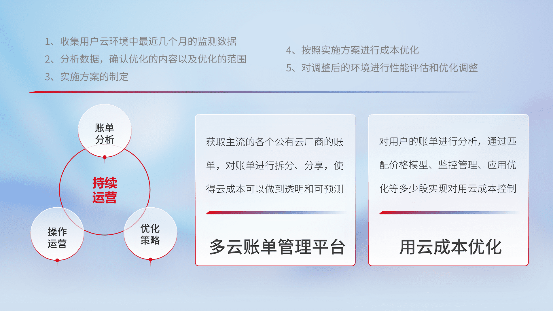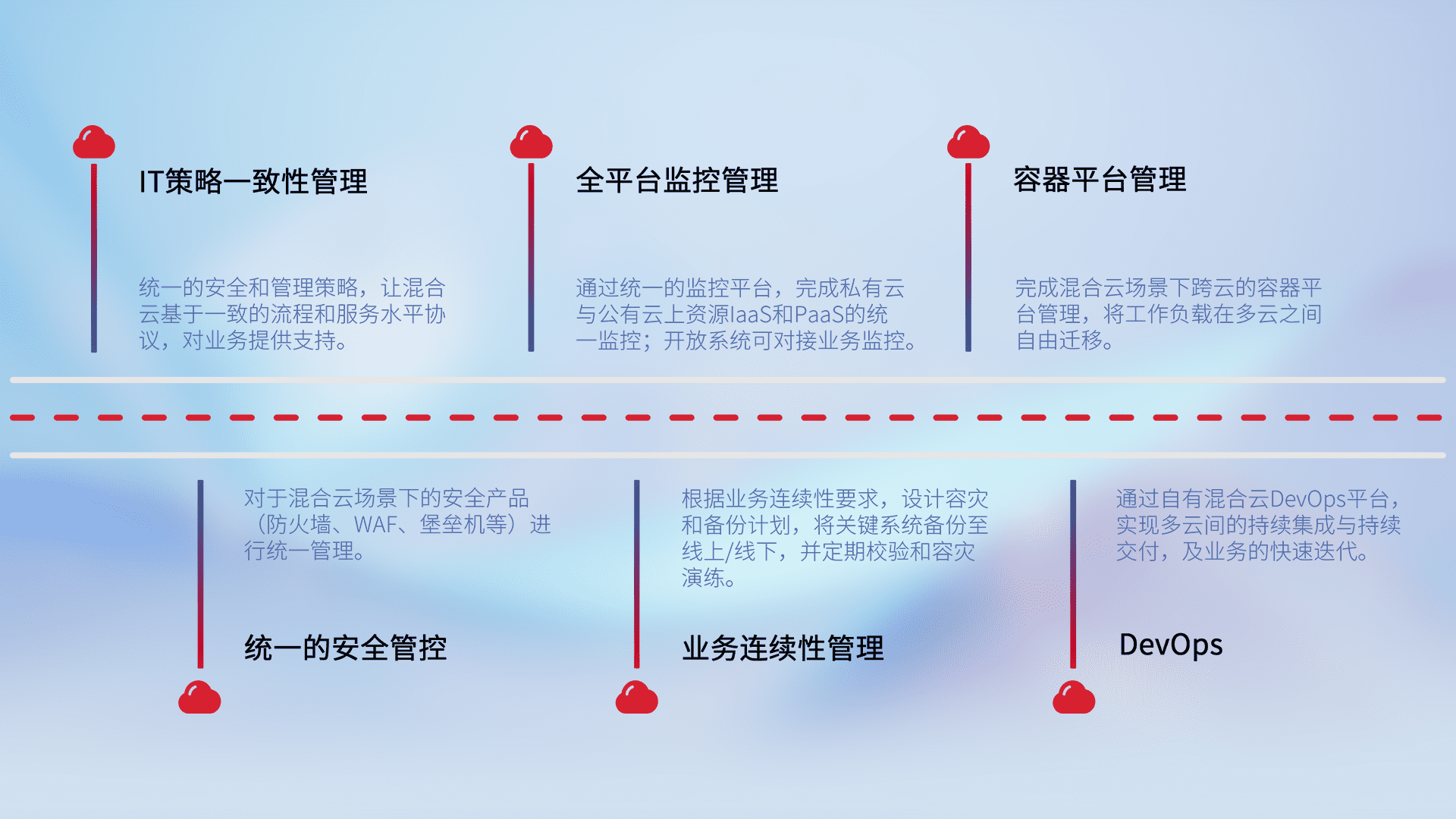 通过多云纳管,,以统一的资源数据模型把客户的云资源进行抽象和封装,,,,进而实现对多云资源的统一操作,,,保障云资源管理的可靠性、、、稳定性与可用性。。量身定制化运维内容,,,,配置、、、、开发运维、、、、补丁管理、、备份、、、监控、、、、认证和访问管理、、、审计和日常巡检等,,,,保障在用云过程中的可靠度,,,,稳定度以及高可用率。。